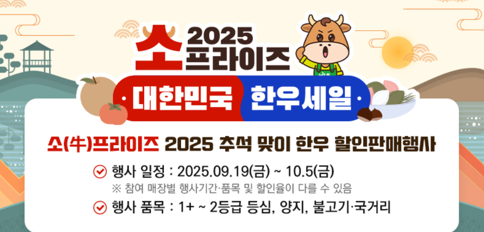 ‘소프라이즈’ 2025년 물가안정 한우세일페스타 행사 안내 2025년 추석 명절(10월 초)을 앞두고 8~9월 한우 도축 두수 및 공급량의 대폭 증가로 인한 경락가격의 하락을 대비하여 선제적인 한우 할